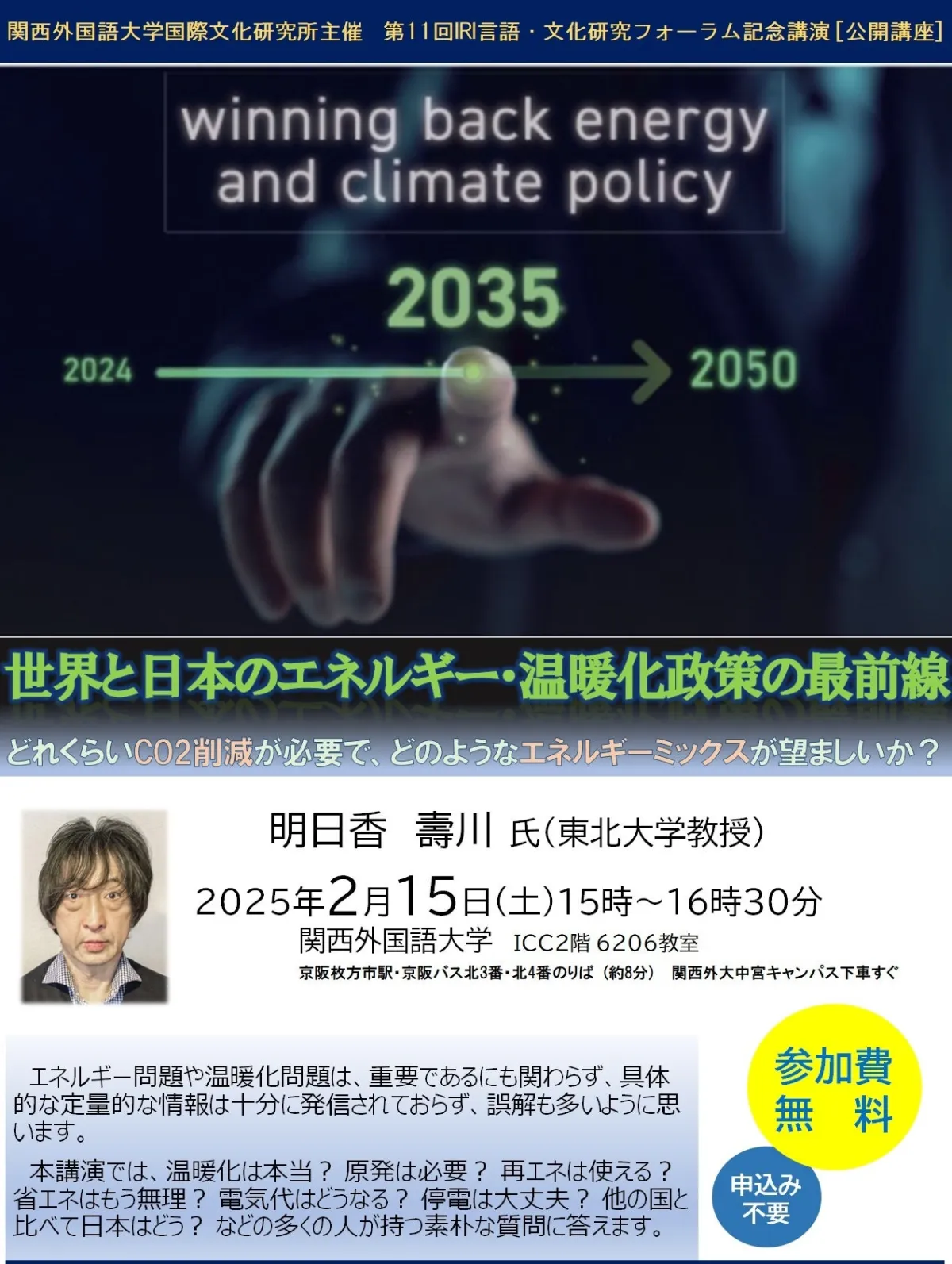 2月15日(土)、大阪府枚方市にある関西外国語大学国際文化研究所では著名な環境科学者であり経済学者でもある明日香壽川教授をお迎えし、第11回IRI言語・文化研究フォーラム記念講演が行われます。講演のテーマは「世界と日本のエネルギー・温暖化政策の最前線」。