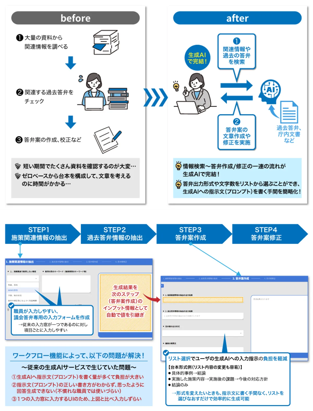 生成AIを用いることで、情報検索から答弁案作成にかかる時間が60%短縮されるという結果が得られました。
