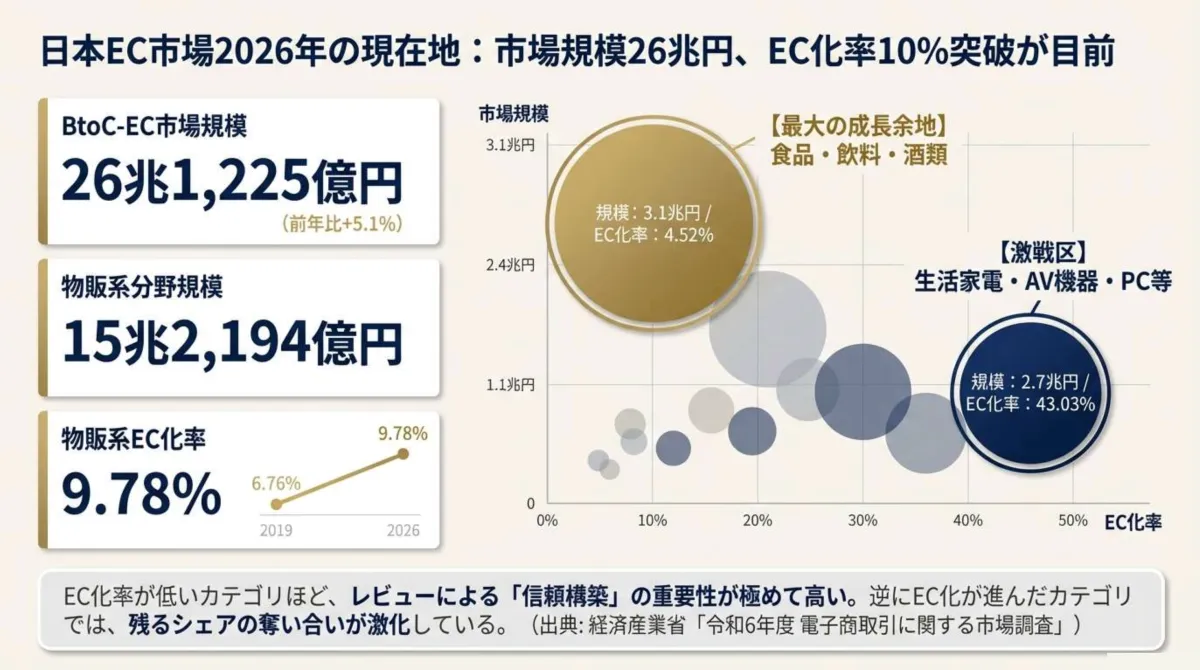 日本のBtoC-EC市場は、26兆1,225億円に達し、前年比5.1%の成長を誇っています。特に物販系ECの化率はじきに10%に迫ろうとしています。その影響で、EC業者の間で競争が激化し、リスティング広告コストが上昇しています。広告は「使い切り型」であるため、持続可能な売上成長を図るには、レビューなどの「ストック型資産」の重要性が一層高まっています。