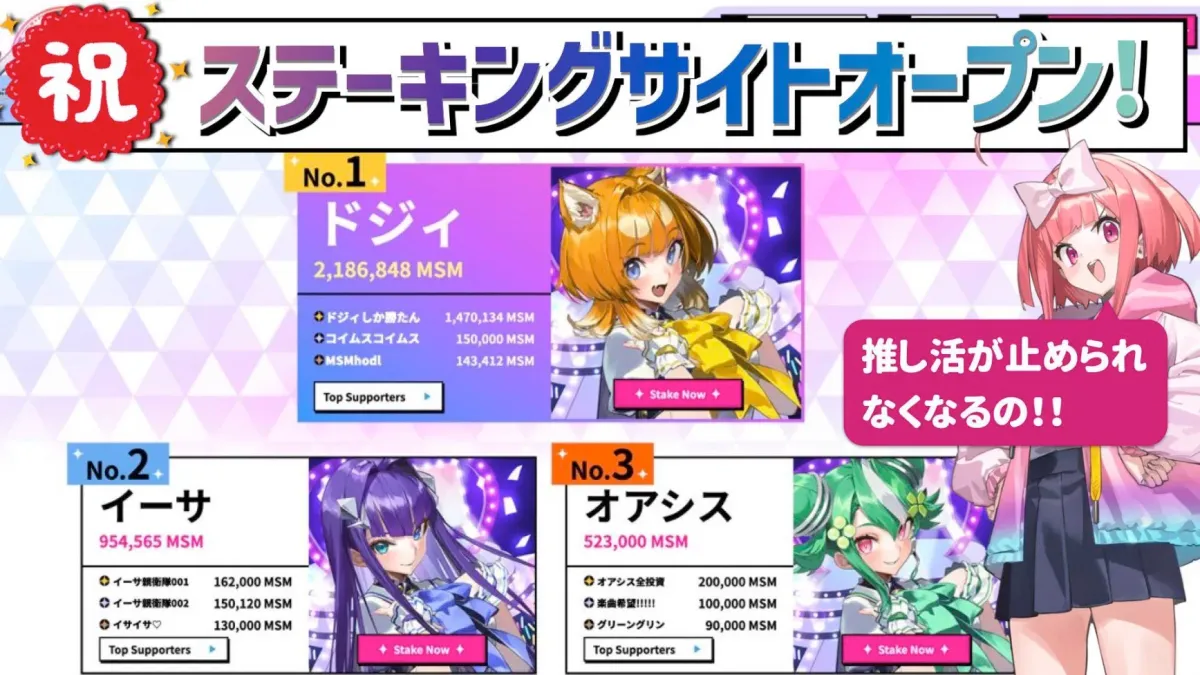 ステーキングとは、プレイヤーが保有する暗号資産をブロックチェーンネットワークに預け入れ、報酬を得られる仕組みです。この機能は、コインムスメの独自トークン「MSM」という暗号資産と、ファン会員NFTの預け入れによって運用されます。プレイヤーは、ステーキングを行うことにより、お気に入りのキャラクターのランキングを向上させたり、限定アイテムを入手したりすることが可能になります。