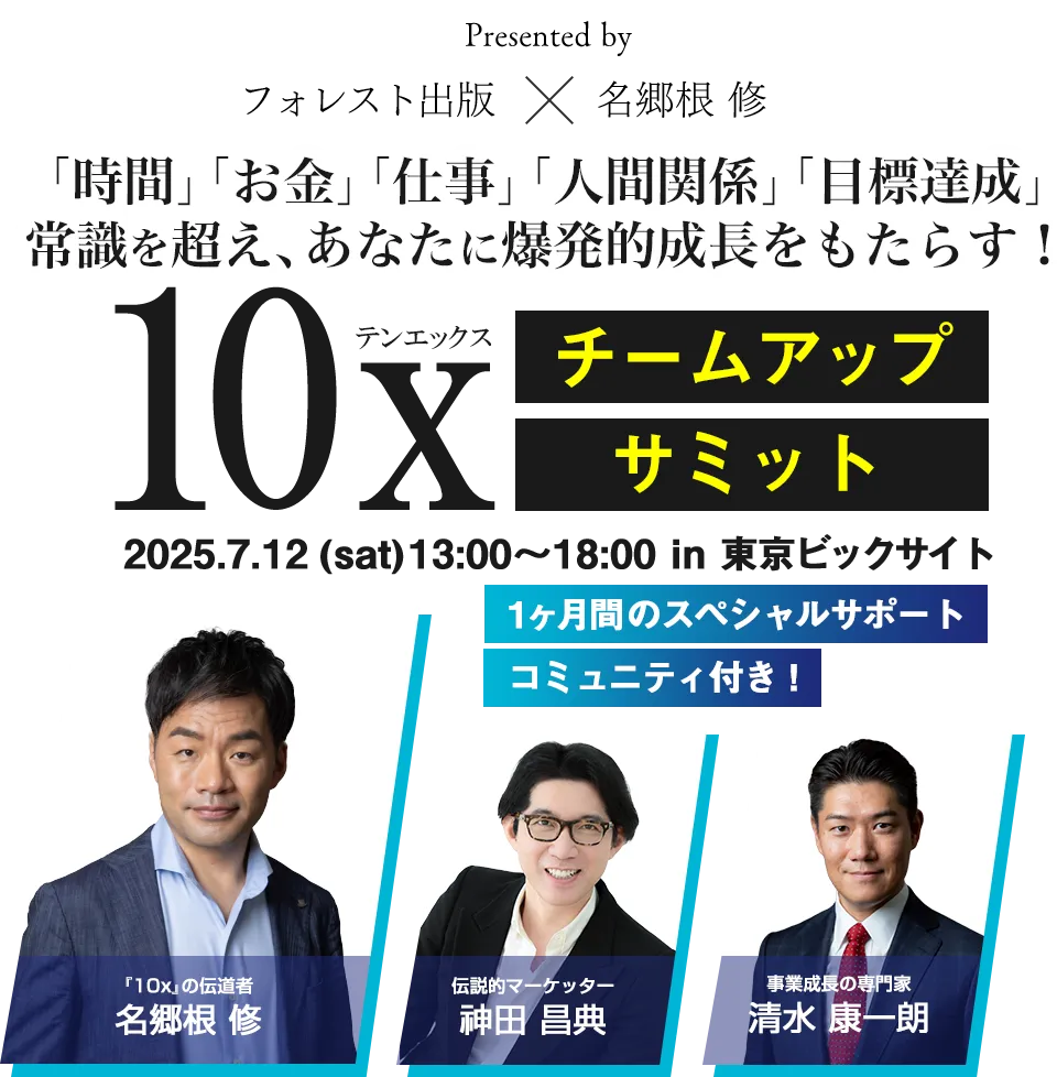 2025年7月12日、東京ビッグサイト・レセプションホールにて、広く知られる「10倍成果」をテーマにした大規模セミナー『10xチームアップサミット』が開催されます。このイベントでは、日本における「10x(テンエックス)」のエヴァンジェリストとして知られる名郷根 修氏が特別講師として登壇し、10x思考を用いて成果を最大化するための具体的な手法を共有します。