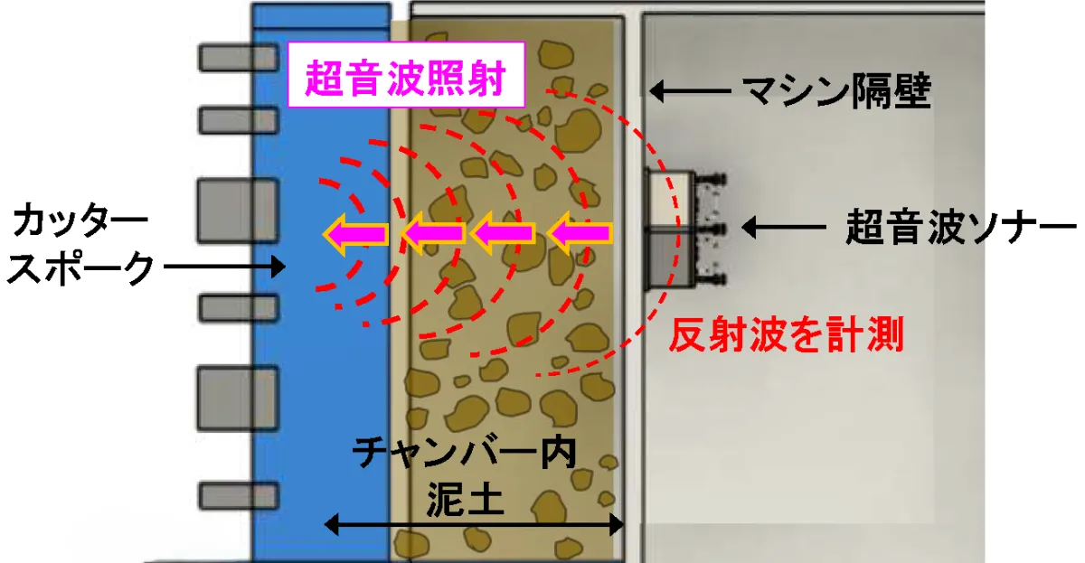 新システムは、シールドマシンの隔壁に設置された超音波ソナーから発信された超音波がカッタースポークに反射し、戻る反射波の到達時間を計測することで、チャンバー内部の泥土性状を音速として数値化します。これにより、掘進中に自動で連続計測を行い、リアルタイムで切羽の状態を把握できるようになりました。