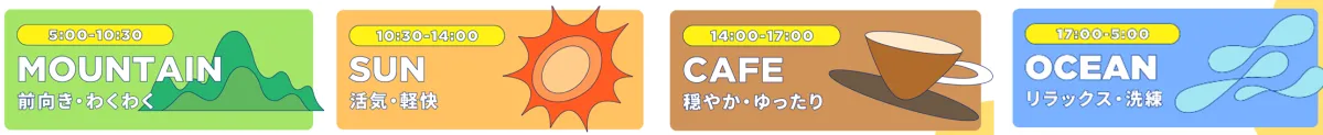 新しいBGMシステムである「モスサウンドセレクション」は、時間帯ごとに四つのテーマが設定されています。「MOUNTAIN」「OCEAN」「SUN」「CAFE」という名称は、リラックスできる環境を提供し、訪れるお客様の心を和ませることを目的としています。さらに、各テーマに応じたチャンネルも設定されており、店舗の立地や来店するお客様に合わせた音楽を選ぶことができます。これにより、さまざまなシーンにフィットする音環境が実現されます。