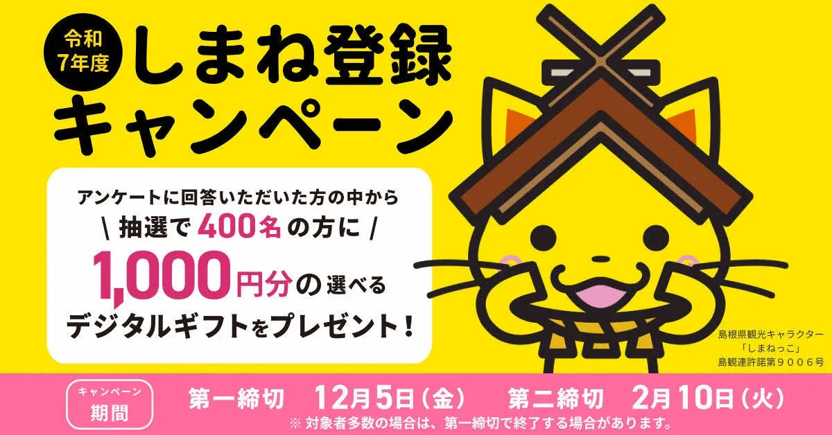 この「しまね登録」に関連して、特別キャンペーンが実施されます。キャンペーン期間は令和7年9月25日から令和7年12月5日までの約2ヶ月間。さらに、人気があれば第一締切で終了する可能性もあります。この期間中に、特定の条件を満たしてアンケートに回答した方の中から、抽選で400名様に1,000円分のデジタルギフト「デジコ」がプレゼントされます。
