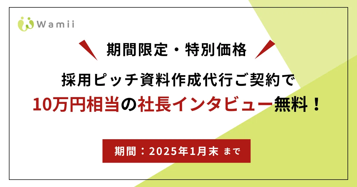 ワミィ株式会社が、新たな施策として「採用ピッチ資料作成代行サービス」を提供しています。2024年12月から2025年1月末までの冬の特別キャンペーンでは、無料面談を受けた上で契約を行ったお客様に、通常10万円相当の「社長インタビュー」を無料で提供します。これは求職者にとって非常に魅力的な採用ピッチを作成するための素晴らしい機会です。