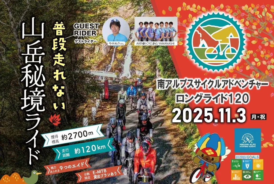 山梨県で11月3日(月・祝)に開催される「南アルプスサイクルアドベンチャーロングライド120」は、自然豊かな南アルプスを舞台にした特別企画です。このイベントでは、普段通行できない山岳秘境のコースが開放され、2900mを超える高低差を体感できるめったにない機会が提供されます。