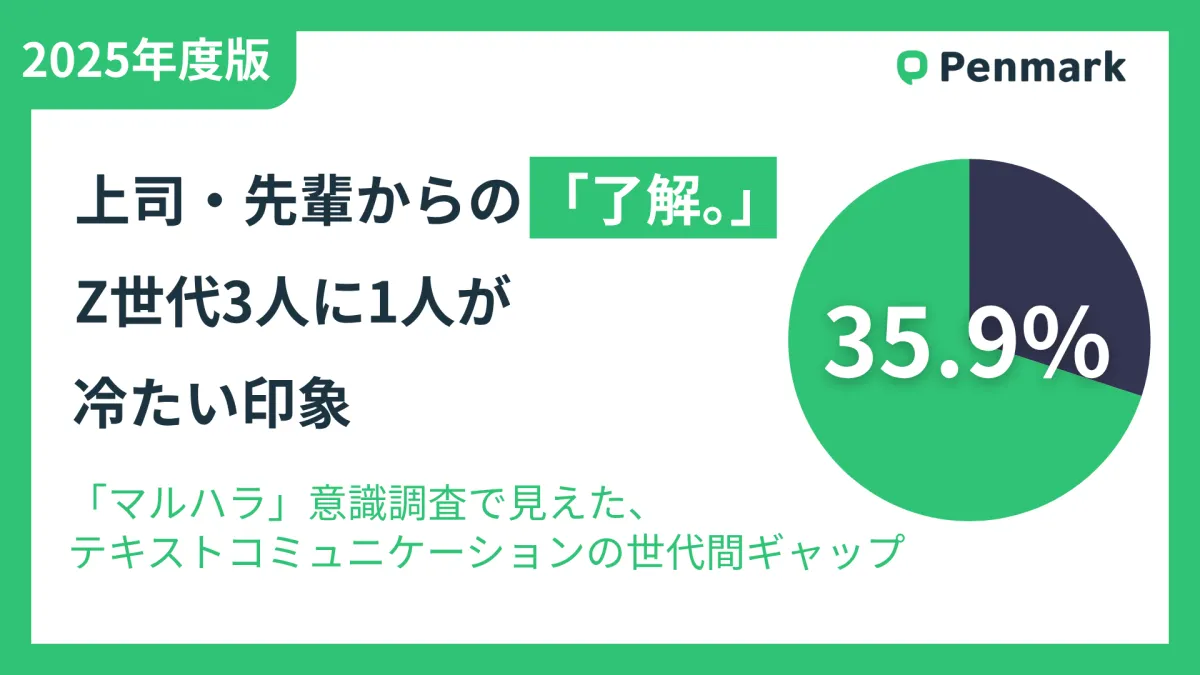 株式会社ペンマークが行った調査によると、Z世代の3人に1人が、上司や先輩からの「了解。」というメッセージに対し、冷たさや事務的な印象を持つことがわかりました。この調査は、全国の大学生や若手社会人594名を対象に、テキストコミュニケーションとそれに伴う「マルハラ」現象について掘り下げたものです。