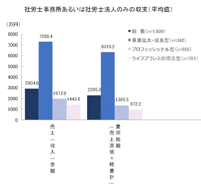 ライフプランとの両立型事務所は、手続業務や相談業務を中心に展開し、平均売上は約1,444万円でした。このタイプは、社労士が個人のライフプランに寄り添うという観点からも、近年注目されています。