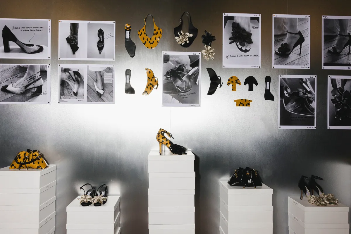 このコレクションは、「JIMMY CHOOの生み出す過程」を視覚化した空間で、Sandra Choiのロンドンデザインスタジオの情景を再現したマルチルームのセットで発表されました。彼女は、1996年のブランド設立以来、数多くのコレクションを手がけてきたクリエイティブ・ディレクターですが、今回は特にJIMMY CHOOの伝統と革新が共存した特別な瞬間を演出しました。
