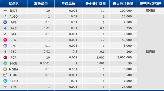 取り扱いを開始する14銘柄は、実に多岐にわたります。具体的には、「ニッポンアイドルトークン(NIDT)」、「アルゴランド(ALGO)」、「エイプコイン(APE)」、「アクシーインフィニティ(AXS)」、「ベーシックアテンショントークン(BAT)」、「チリーズ(CHZ)」、「エンジンコイン(ENJ)」、「イーサリアムクラシック(ETC)」、「エフシーアールコイン(FCR)」、「メイカー(MKR)」、「モナ(MONA)」、「オーエムジー(OMG)」、「サンドボックス(SAND)」、最後に「トロン(TRX)」です。これらの新規銘柄の追加により、ユーザーはより多様な選択肢を手に入れることができ、暗号資産取引の可能性が広がります。