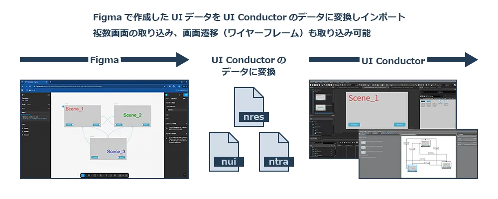 Figma上で作成されたUIデータを直接UI Conductorに取り込むことが可能になりました。この機能によって、複数画面や画面遷移も含めて、デザインからプロトタイプへの工数を大幅に削減することができます。これまで手動で行っていたデータの移行作業が軽減されるため、開発スピードの向上が期待されます。