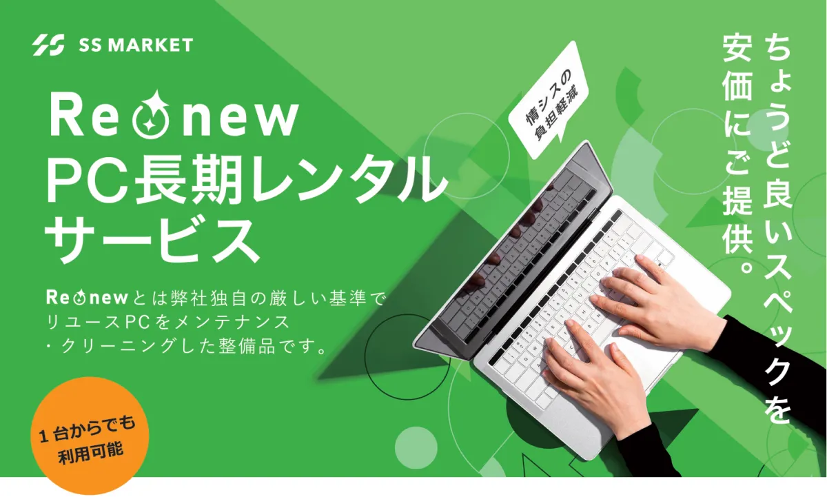 「Re:new PC長期レンタルサービス」は、高品質なリユースPCを提供するもので、企業が必要とするスペックに合わせて選定されたPCを長期間にわたって利用できます。SSマーケットは、13年間にわたってリユースPCの整備を行ってきた知見を活かし、品質基準を満たす製品を厳選。最新モデルではなく、業務に最適なスペックを利用することで、導入コストを抑えることが可能です。