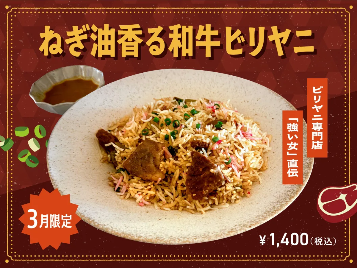 新たに仲間入りしたのは、「ねぎ油香る和牛ビリヤニ」。価格は¥1,400(税込)で、鹿児島黒牛の旨味とスパイスが絶妙に絡み合っており、その味わいは格別です。本場インドのバスマティライスを使用し、産地直送の深谷ねぎをアクセントに加えています。このビリヤニの炊き方は、埼玉県のビリヤニ専門店「強い女」のシェフから伝授されたもので、一皿一皿に心が込められています。肉の旨味が感じるルゥとともに、様々な味の変化もお楽しみいただけます。