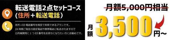 1. 転送電話2点セットコース(住所+転送電話):月額3500円で、電話転送サービスも利用可能です。ビジネスに欠かせない03番号を持ち、名刺にも記載できます。