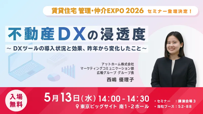 不動産情報サービスを提供するアットホーム株式会社が、2026年5月に東京ビッグサイトで開催される「賃貸住宅管理・仲介EXPO 2026」にてセミナーを行うことが発表されました。このイベントは、賃貸住宅の管理や仲介に特化した専門展で、住まいや建築、不動産に関連した多様な出展社が新商品やサービスを紹介する日本最大級のイベントです。