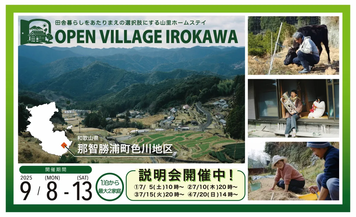 和歌山県那智勝浦町に位置する色川地区で、2025年9月8日から13日まで、若者向けの田舎暮らし体験イベント「オープンビレッジ色川」が開催される。この取り組みは、「都会での暮らしは本当に当たり前なのか?」との疑問から生まれ、特に都市に住む若者がどう田舎での人生を選択できるかを探求するものだ。