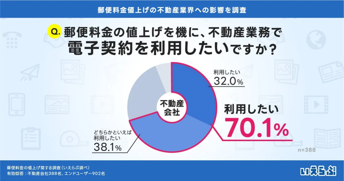 株式会社いえらぶGROUPが実施した「郵便料金の値上げに関する調査」によると、2024年10月1日から施行される郵便料金の値上げに対し、約7割の不動産会社が電子契約の導入に前向きな姿勢を示しています。