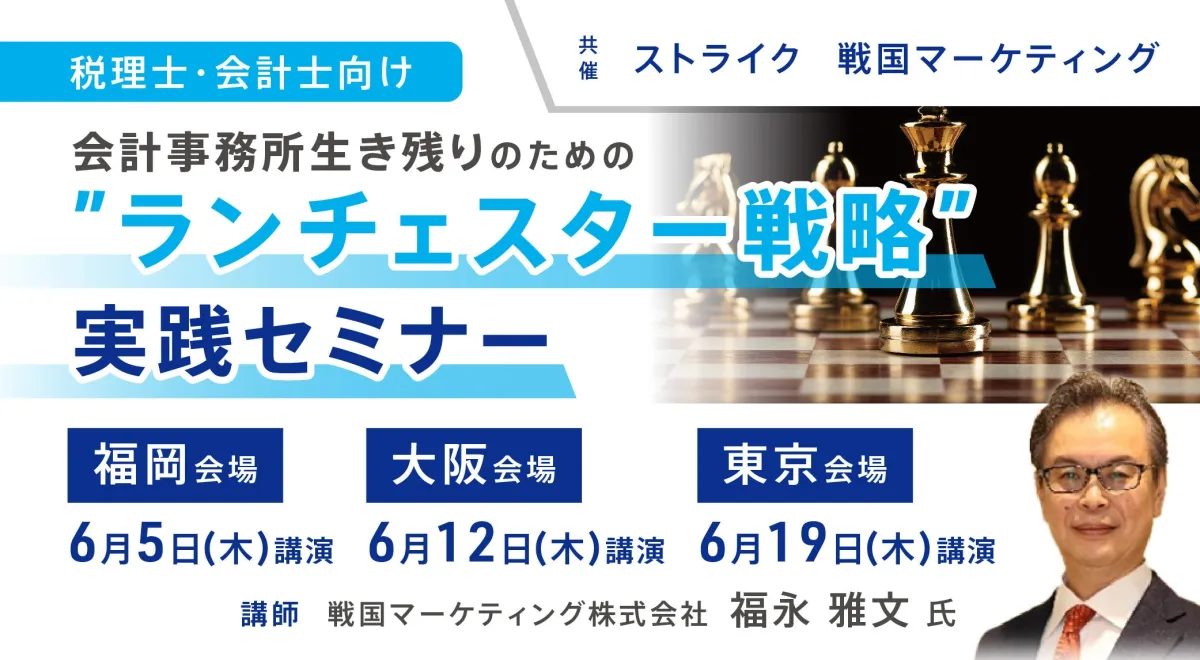 株式会社ストライクが、戦国マーケティング株式会社と共に、税理士や会計士を対象とした「ランチェスター戦略」実践セミナーを開催します。これからのビジネスに必要な経営戦略を学ぶ貴重な機会です。このセミナーは2025年に、福岡、名古屋、東京の各地で行われます。
