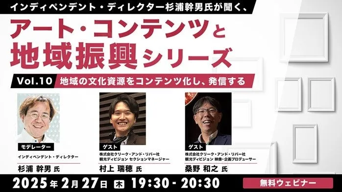 株式会社クリーク・アンド・リバー社(C&R社)は2025年2月27日(木)、地域振興に関心のある企業や自治体職員、クリエイターを対象としたオンラインセミナーを開催します。このセミナーでは、地域に根ざした文化資源をどのようにコンテンツ化し、地域振興に活かすのかがテーマです。