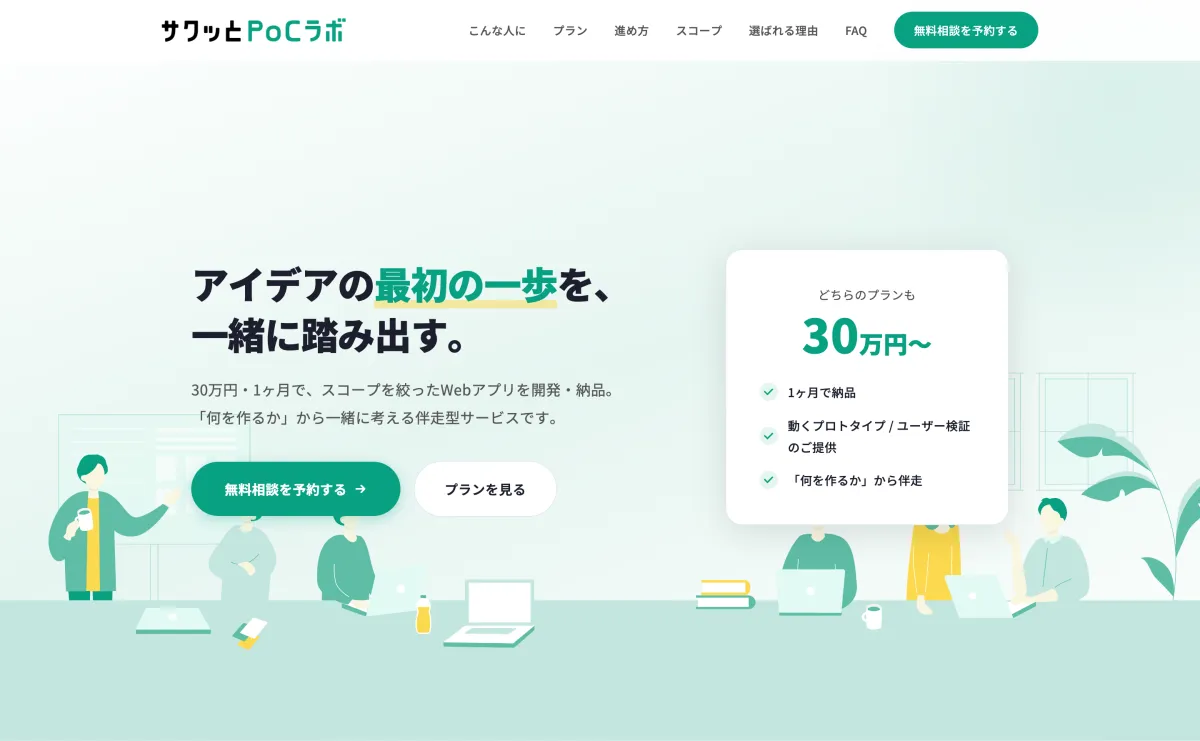 「サクッとPoCラボ」では、動くプロダクトを納品する「プロトタイピングプラン」と、デザインスプリントを通じて仮説を検証する「ビジネス検証プラン」の二つの選択肢が用意されています。顧客の状況に応じた最適なプランを無料相談で一緒に決定し、開発すべきか検証を優先すべきかの判断もサポートします。