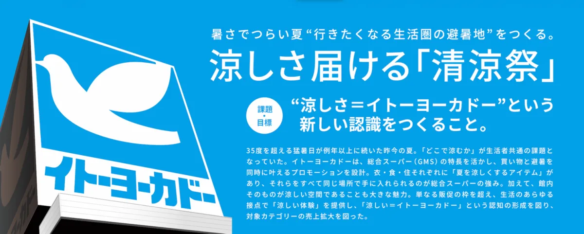 「青いヨーカドーの清涼祭」は、日本の夏におけるイトーヨーカ堂の店舗価値を再定義することを目的としたリテールマーケティング施策です。消費者が涼しさを求める中、店舗を「涼しさを届ける場所」として提案し、幅広い商品をそろえて来店を促しました。このキャンペーンでは、イトーヨーカ堂のアイデンティティであるロゴを青に染め上げ、シンプル且つインパクトのある「青いヨーカドー」というコンセプトを打ち出しました。これにより、戦略的に店舗の様相を変更し、消費者の興味を引くことに成功したのです。