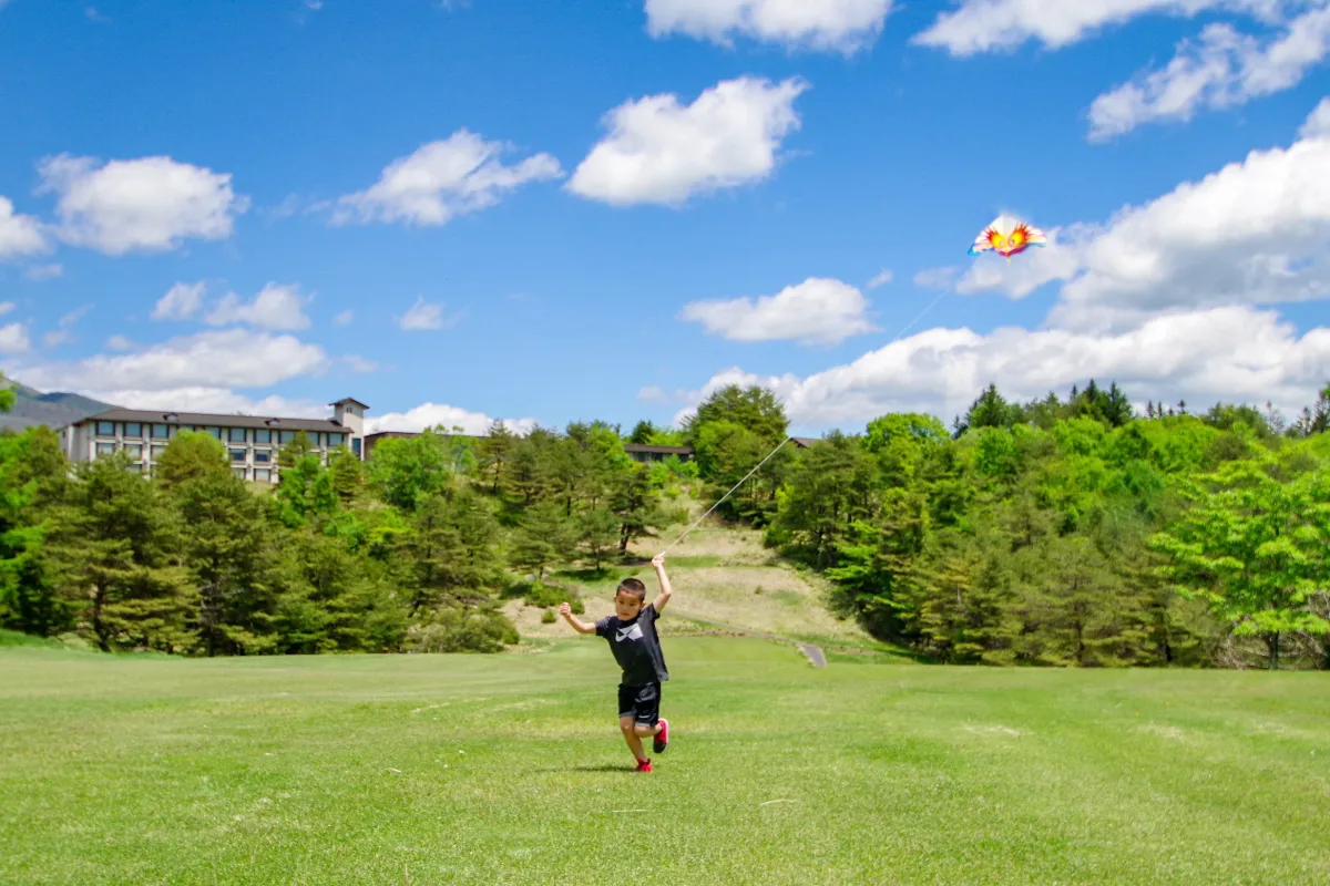当日は、青空の下で思いっきり体を動かすことができる環境が整っています。元気いっぱいに走り回ったり、凧揚げをしたり、楽しいアウトドアアクティビティを満喫することができます。その後は、ゆったりと温泉に浸かり、疲れを癒すひとときをお楽しみください。