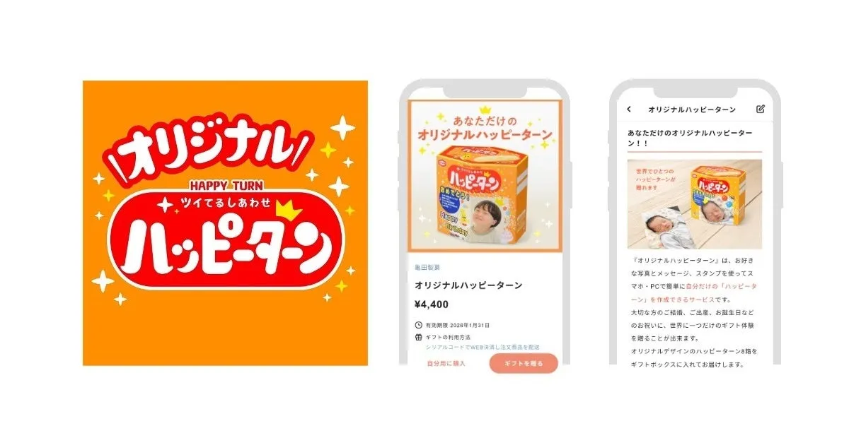 新サービス『オリジナルハッピーターン』では、お好きな写真やメッセージをパッケージに加えた、自分だけの特別なハッピーターンを制作できます。このサービスは、お誕生日や結婚式、学校のイベントなど、さまざまなシーンで活用可能です。特別感を演出するギフトとして最適です。