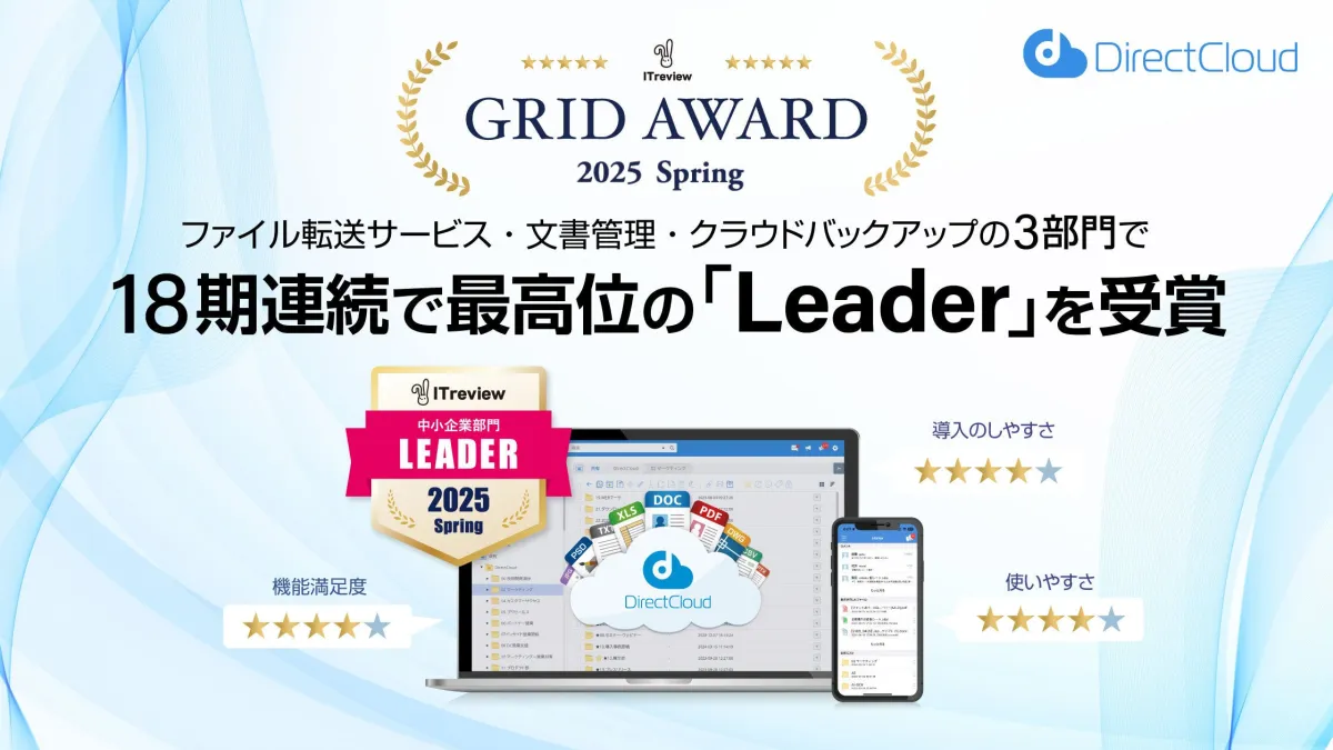 法人向けクラウドストレージを提供する株式会社ダイレクトクラウドが、アイティクラウド株式会社が主催する「ITreview Grid Award 2025 Spring」で、なんと18期連続で最高位の「Leader」を受賞したという嬉しいニュースが飛び込んできました。この成果は、「ファイル転送サービス」、「文書管理」、「クラウドバックアップ」の3つの部門において実現され、特に「オンラインストレージ」部門に関しては13期連続の受賞となります。