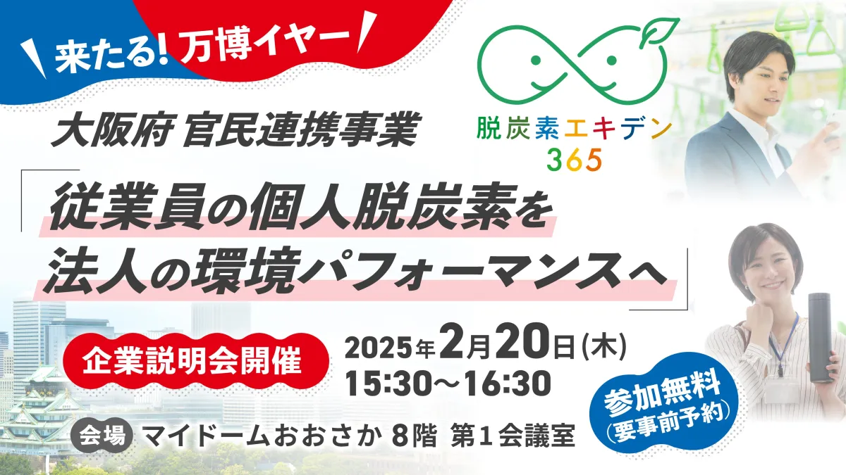 このプロジェクトの一環として、2月20日(木)には「脱炭素エキデン365」企業説明会が開催されます。開催場所は、大阪市中央区のマイドームおおさかです。企業説明会では、大阪府の職員やスタジオスポビーの代表が登壇し、脱炭素活動の重要性や、具体的な取り組み内容について熱く語ります。