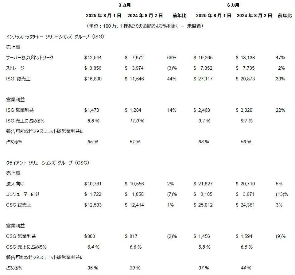 第2四半期の売上高は前年同期比44%増の168億ドルに達しました。サーバーおよびネットワークの売上高は69%増の129億ドル、そして営業利益は過去最高となる15億ドルに達しています。一方でストレージの売上高は前年同期比で3%減の39億ドルという結果でした。