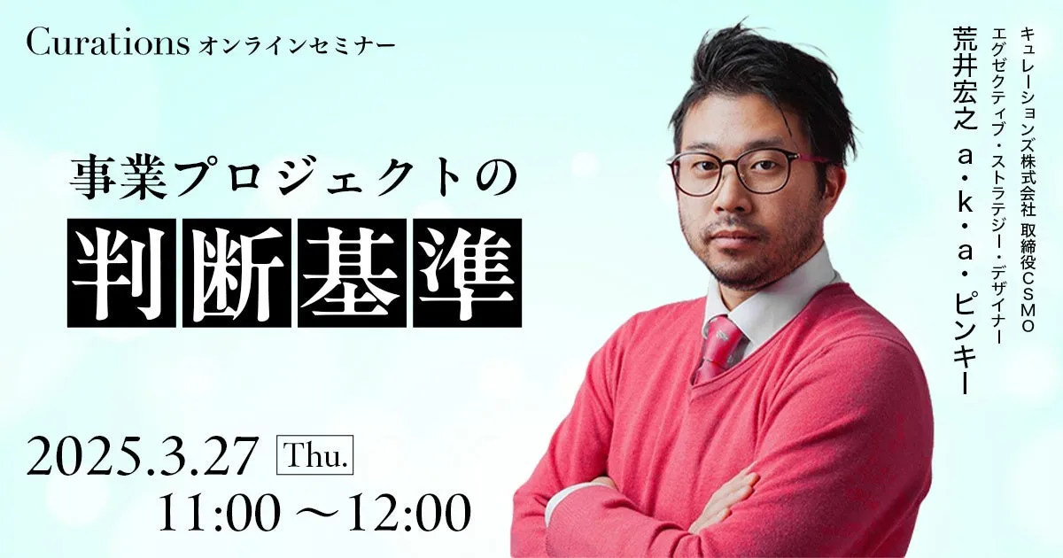 キュレーションズ株式会社は、2025年3月27日(木)11:00から『事業プロジェクトの判断基準』に関する無料オンラインセミナーを開催します。本セミナーは、経営戦略や事業企画、技術戦略担当者など、ビジネスの現場で意思決定を行う方々に最適な内容となっています。
