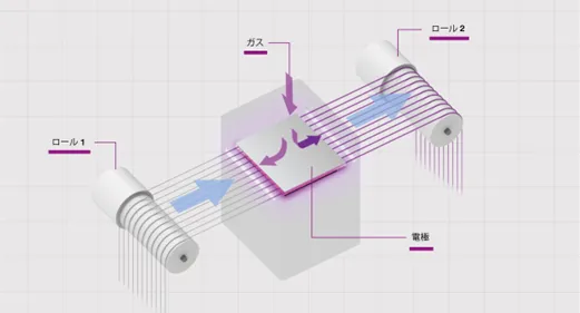 この装置の最大の魅力は、低温で均一かつ高密度なプラズマ環境を生成できる点です。処理温度が約100℃以下であるため、熱に弱い素材や複雑な構造を持つ繊維でも安全に表面改質が行えます。従来のプラズマ処理では難しかった繊細な素材にも、この技術を使うことで新たな特性を付与することが可能です。