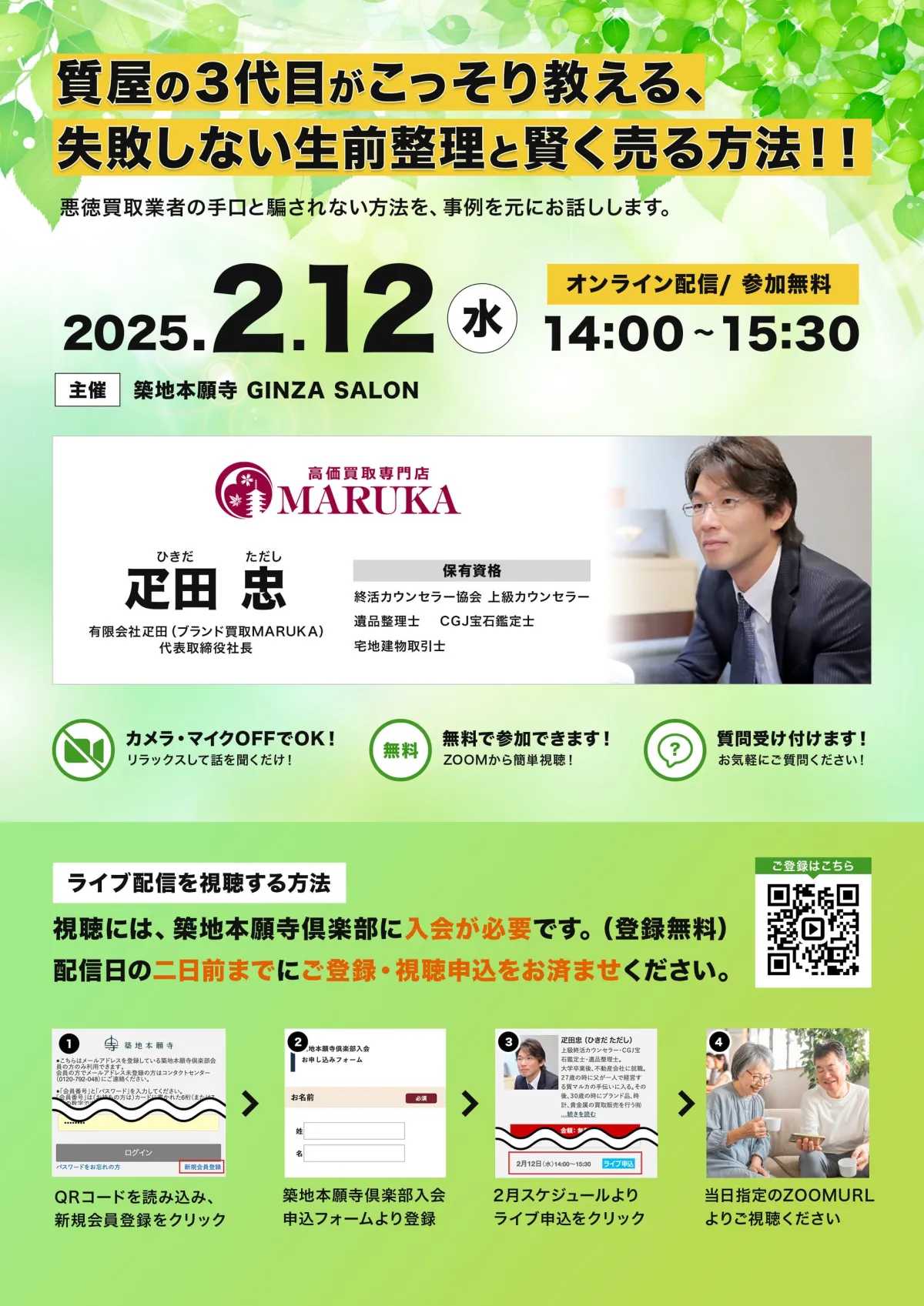 来年2月12日、築地本願寺で「質屋の3代目がこっそり教える、失敗しない生前整理と賢く売る方法!!」という興味深いセミナーが開催されます。貴重なこの機会に、自分自身の生涯の準備について考えてみませんか?