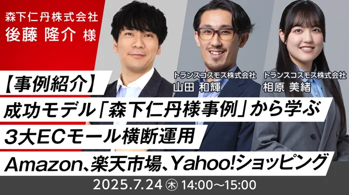 トランスコスモス株式会社は、2025年7月24日(木)にオンラインセミナー「成功モデル『森下仁丹様事例』から学ぶ3大ECモール横断運用 -Amazon、楽天市場、Yahoo!ショッピング-」を開催します。近年、多くのECモールに出店する企業が増加する中、売上を安定的に伸ばすための取組みは重要です。今回のセミナーでは、「森下仁丹」の成功事例をもとに、実際の施策や成果を交えた具体的な内容をお届けします。