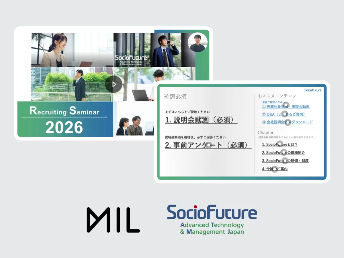 SocioFutureは以前からライブ配信での会社説明会を実施していましたが、年間90回・495時間にも及ぶ配信には業務課題がありました。そこで、「MIL HR Seminar」を導入し、ライブ式からインタラクティブ動画に転換。それにより、年間495時間の工数を削減し、社員が学生とのフォロー活動にもっと集中できるようになりました。