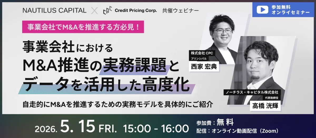 2026年5月15日(金)、事業会社のM&Aに関心のある方々に向けたウェビナーが開催されることとなりました。このウェビナーでは、ノーチラス・キャピタル株式会社と株式会社クレジット・プライシング・コーポレーションが共催し、M&A推進の実務課題や、データを駆使したソーシングの高度化について深掘りします。