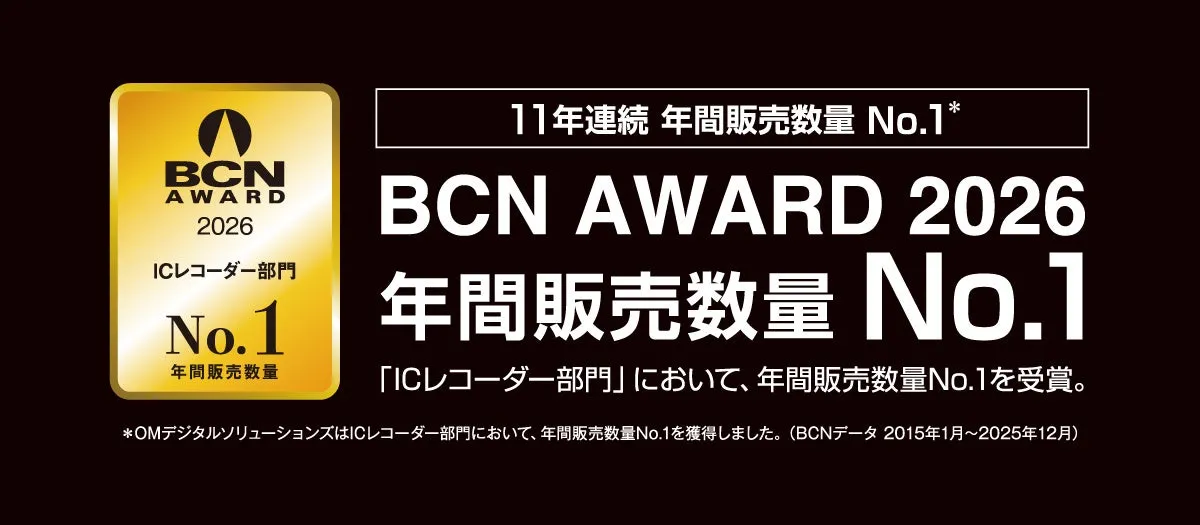OMデジタルソリューションズが展開する映像製品ブランド「OM SYSTEM」のICレコーダーが、名誉ある「BCN AWARD 2026」において年間販売数量No.1を受賞しました。この受賞は、11年連続の快挙であり、通算19度目になります。2025年には、ICレコーダー部門における国内年間販売数量シェアが42.3%に達し、改めてその実力を証明しました。
