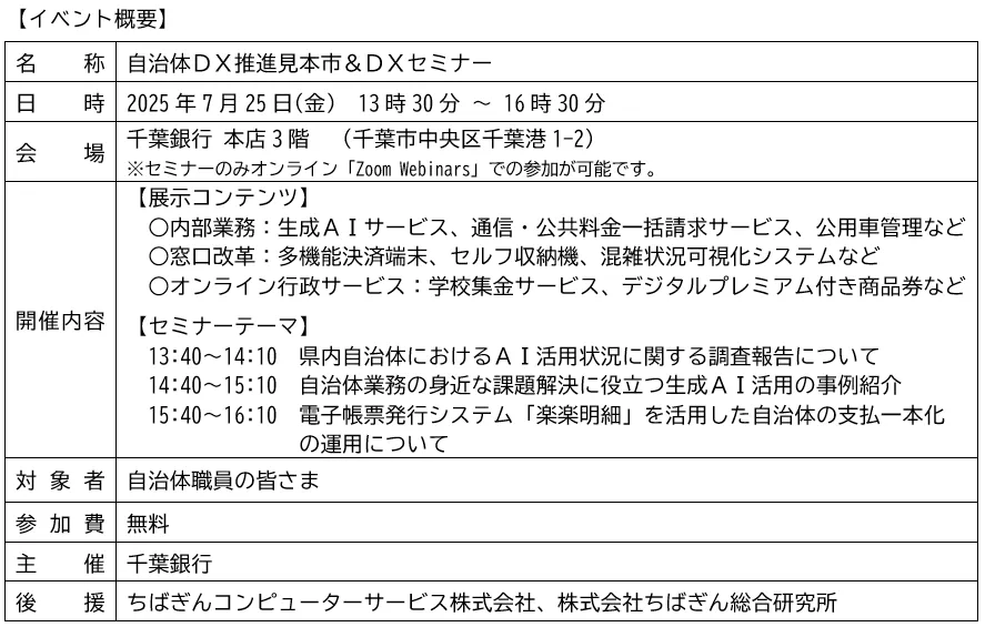 千葉銀行が主催する「自治体DX推進見本市&DXセミナー」が、2025年7月25日(金)に開催されることが決定しました。このイベントは、デジタル技術を活用して行政サービスの向上を目指すことで、地域の発展に寄与しようとする取り組みの一環です。