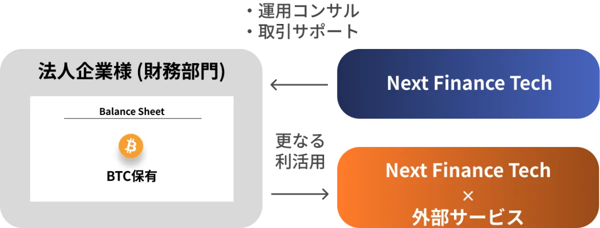 株式会社Next Finance Techは、暗号資産の運用や管理のための技術的専門性を持ち、企業向けの多様なソリューションを提供しています。代表取締役の徳力創一朗は、企業の資産運用に豊富な経験を有しており、デジタル資産の活用を推進しています。具体的には、モダンな金融資産運用の知識とデジタル技術を融合させることを通じて、企業のビットコイン活用を直接支援しています。