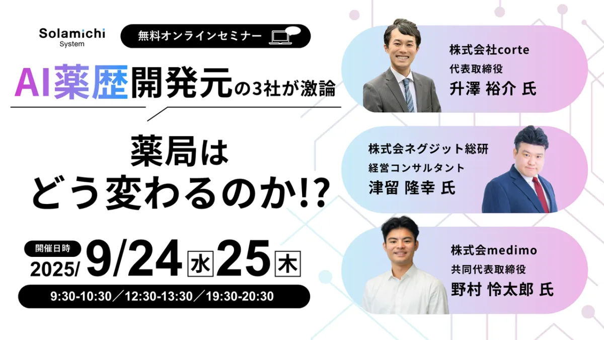 2023年9月24日と25日、株式会社ソラミチシステムが主催する無料オンラインセミナー「AI薬歴開発元の3社が激論!薬局はどう変わるのか!?」が開催されます。このセミナーは、今後の薬局におけるAI薬歴の役割や進化について、業界の専門家たちが集まり議論を交わす素晴らしい機会です。