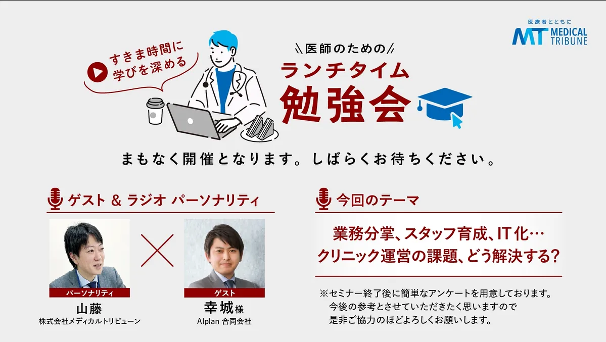 2024年8月27日、Alplan合同会社の幸城裕樹代表が、メディカルトリビューンのYouTubeチャンネルで行われたランチタイム勉強会に登壇しました。この勉強会は医療従事者を対象に、クリニック運営における多様な課題に焦点をあてたもので、129名の医療従事者が参加し、視聴者の平均視聴時間は約20分でした。