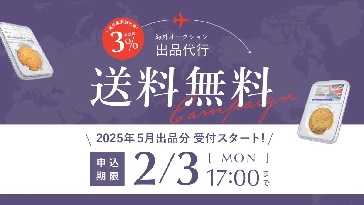 さらに、現在「海外オークション出品代行 送料無料キャンペーン」を実施しています。このキャンペーンでは、通常3万円で発生する送料が無料になり、出品手数料も業界最安値の3%で提供されています。出品先は、2025年5月にアメリカで行われるヘリテージオークションです。