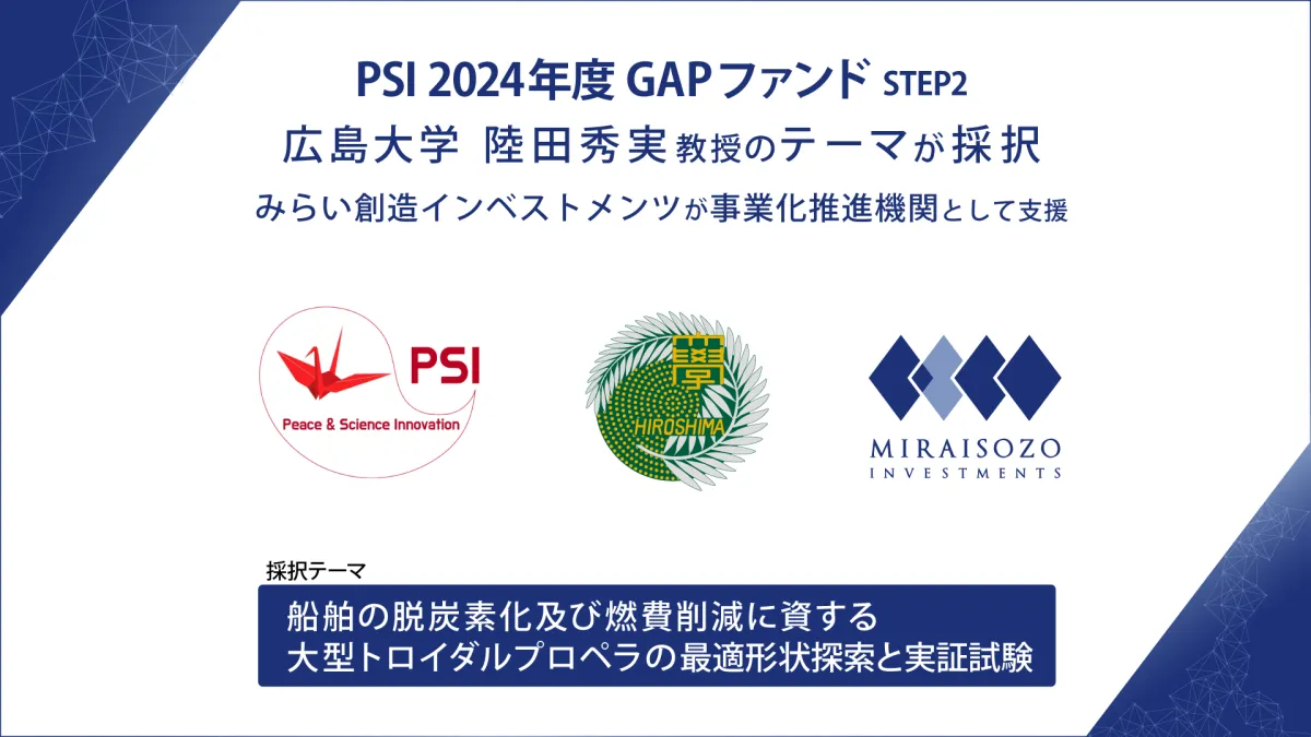 このたび、国立大学法人広島大学の陸田秀実教授が、科学技術振興機構(JST)が提供するPSI GAPファンドの「2024年度 STEP2」にテーマを採択されました。このプロジェクトは、船舶の脱炭素化および燃費削減を目指すもので、トロイダル形状の船舶プロペラに関する研究を中心に展開されます。