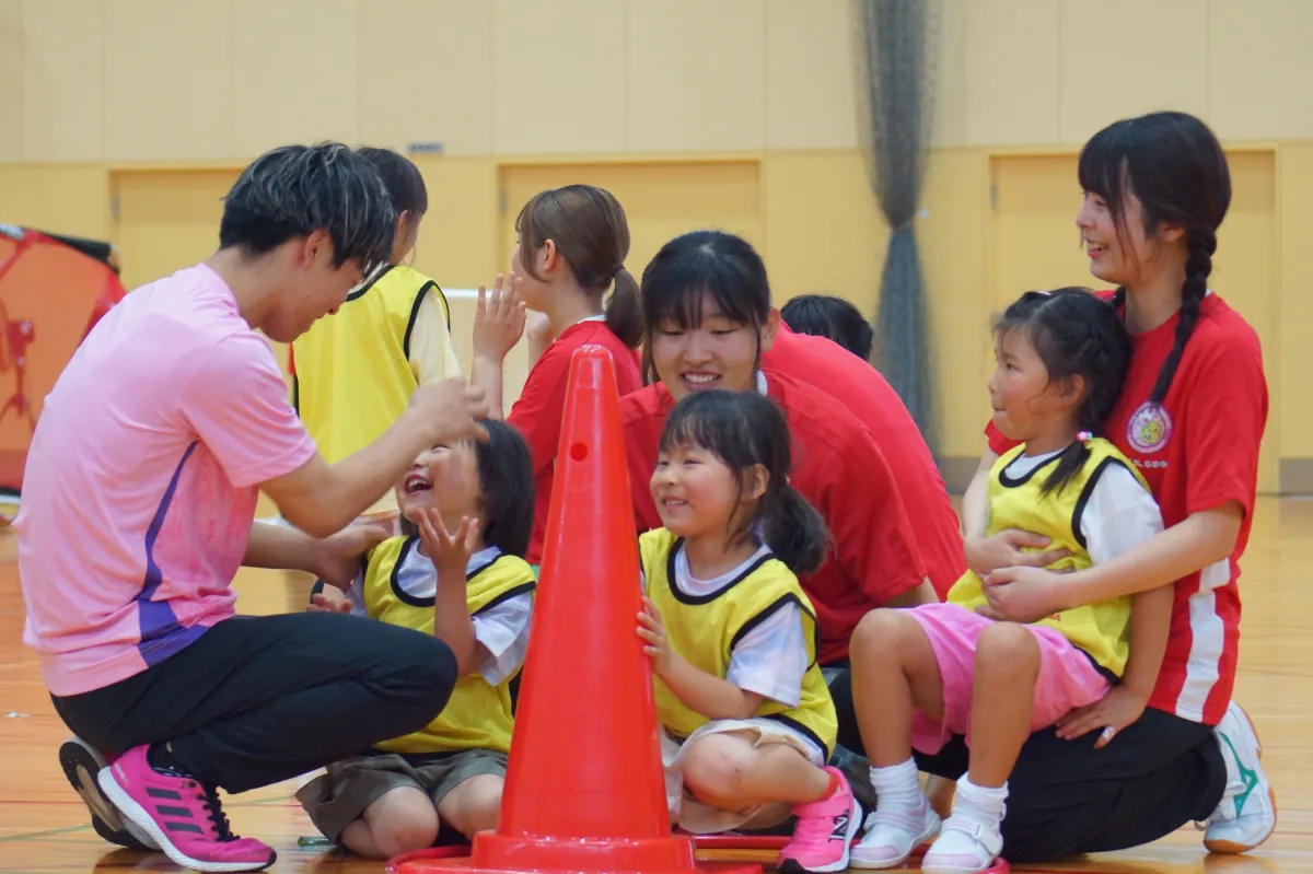 「なでしこひろば」のキャッチフレーズは「笑顔とハイタッチ」。指導する学生たちは、保育士や教員を目指しているため、子どもたちに寄り添った教育を行っています。授業で学んだ理論や遊びの指導法を活用し、楽しく運動できるように配慮しています。初めて参加する子どもも大歓迎です。
