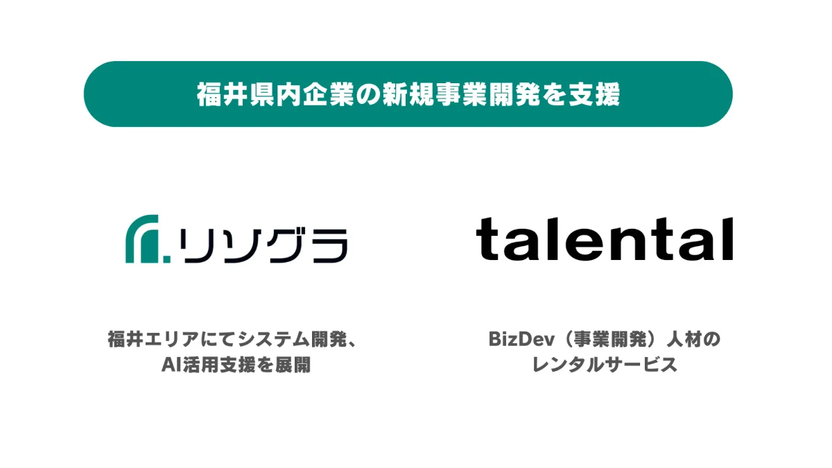 中小企業庁の調査によると、国内の中小企業のうち新規事業展開に取り組む割合は約25%であり、特に地方企業が直面しているのは「必要な技術やノウハウを持つ人材が不足している」という点です。このような状況を受けて、talentalは自身のBizDev人材のレンタルサービスを活かし、リソグラと力を合わせて地域の企業をバックアップすることを決定しました。