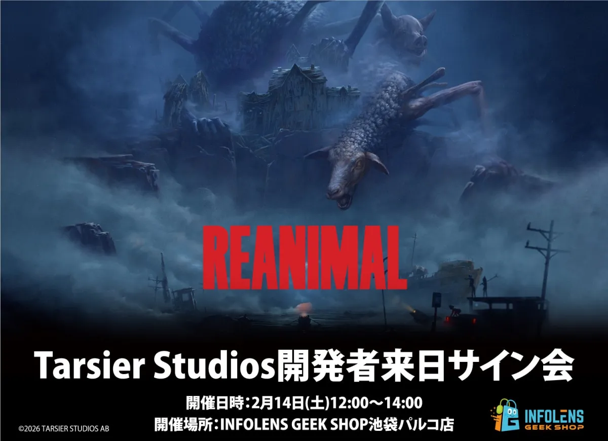 エンターテインメント関連商品を手掛けるインフォレンズ株式会社が、15年以上の歴史を持つゲーム開発スタジオTarsier Studiosの最新作『REANIMAL』の発売を記念して特別なイベントを用意しました。2026年2月13日にリリースされる『REANIMAL』のローンチに際し、開発者の来日サイン会が池袋のINFOLENS GEEK SHOPパルコ店において、2026年2月14日(土)に行われます。