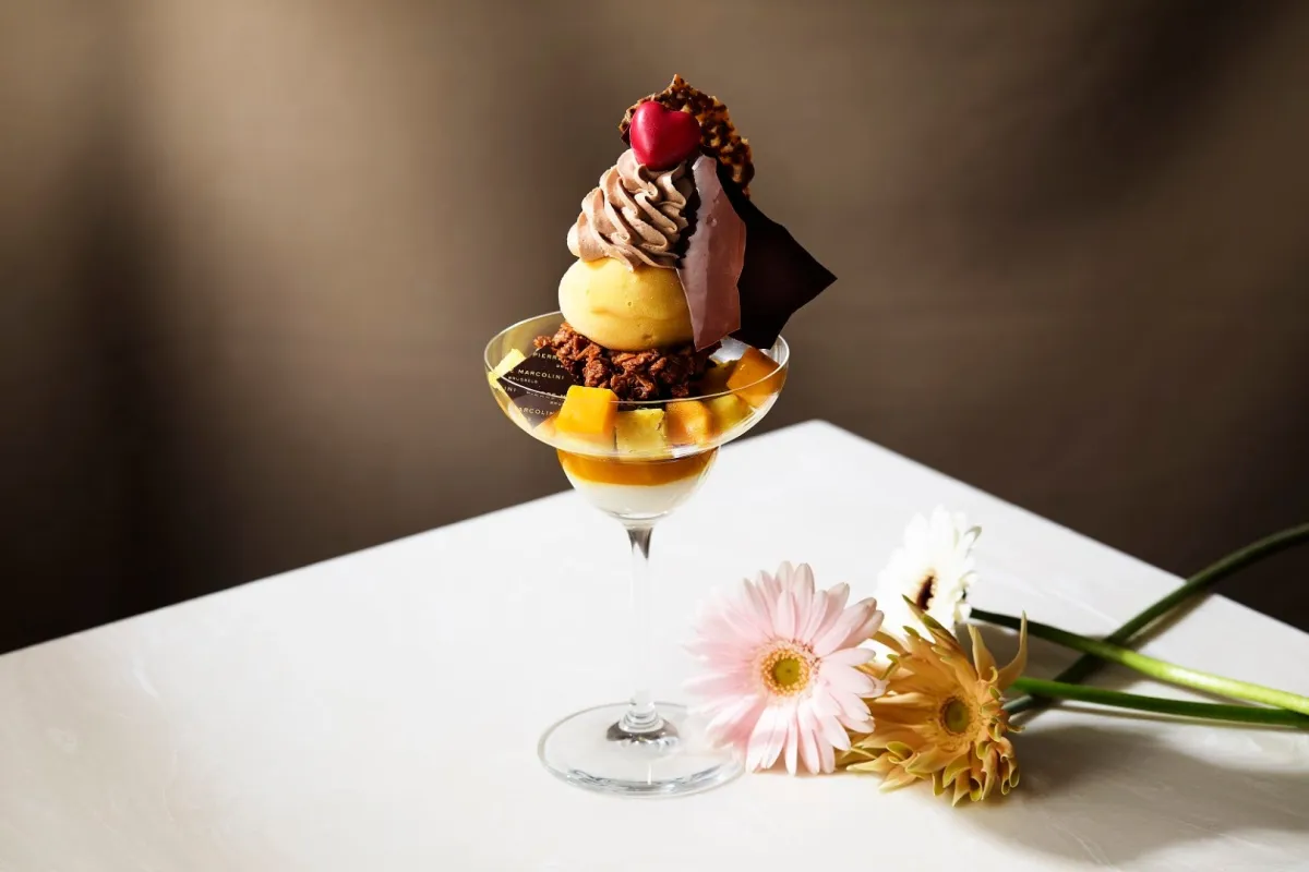 パフェのトップには、ライムの皮でマリネしたマンゴーやパイナップル、マンゴー・パッションソルベが飾られ、見た目にも華やかです。さらに、チョコレートシャンティやカカオのチュイル、板チョコも添えられ、食感と味わいの両方で楽しませてくれます。特に、ピエール マルコリーニのトレードマークでもある赤いハート「クール フランボワーズ」は、インスタ映え間違いなしのポイントです。