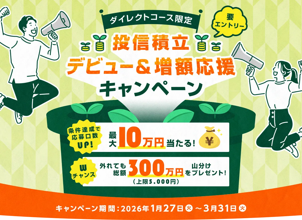 2026年1月から、投信積立デビュー&増額応援キャンペーンがスタートします。このキャンペーンに参加することで、抽選で現金や山分けプレゼントを獲得するチャンスがあります!