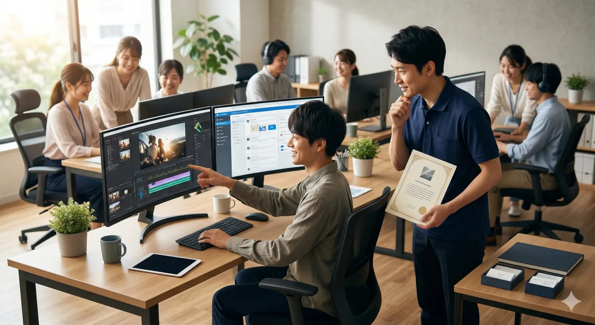 多くの就労継続支援B型事業所が直面する「低い報酬」に対する課題を克服するため、「ドリームクエスト津田沼」では、付加価値の高いIT・Webスキルの習得に特化しています。動画編集に加え、最近需要が急増しているWebデザイン(特にLP制作)の訓練を取り入れ、PC初心者からすぐにプロジェクトを担当できるまで成長している利用者さんもいます。このような取り組みにより、就労継続支援B型事業所の新しい働き方を提案しているのです。