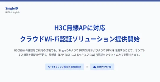 株式会社SingleIDが新たに開発したクラウドベースのWi-Fi認証サービス「SingleID」により、H3C Technologies社の無線アクセスポイント(AP)でも、簡単かつ安全にWi-Fi接続を実現できるようになりました。このサービスは、オンプレミス機器や固定グローバルIPが不要で、証明書(EAP-TLS)を活用した安全な無線認証をクラウドのみで行うことができます。